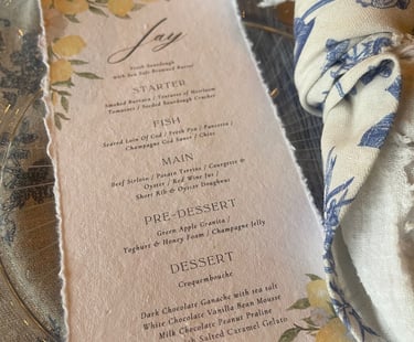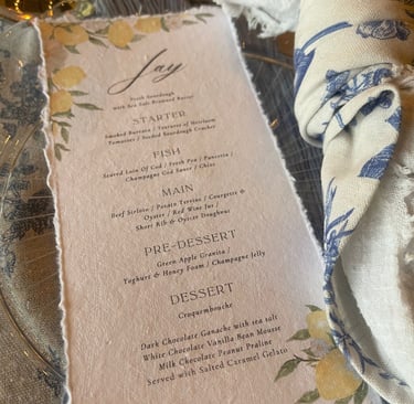 Printed Custom Menus: If you would like each place setting to have a named menu, with the design of your choice (to match your event!) this is priced at 2euro pp.